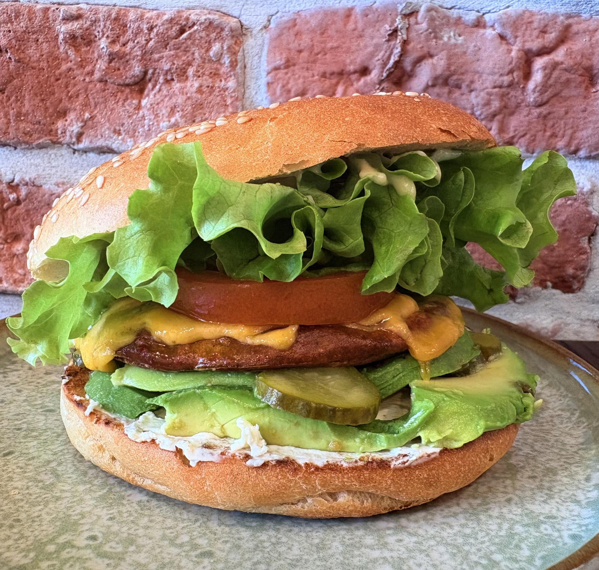 Croque Le Green, le bagel 100% végétarien qui regorge de fraîcheur ! Cream cheese onctueux, cheddar fondant, avocat crémeux, salade et tomates fraîches, cornichons croquants et une galette de pommes de terre et poivrons, le tout nappé de mayonnaise gourmande. Un concentré de saveurs veggie qui fait du bien !