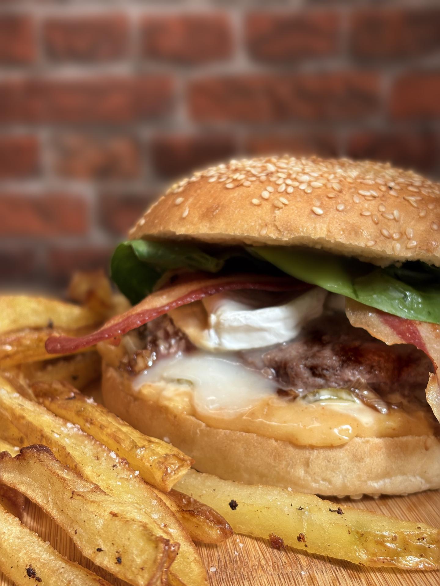 Découvre Le Nutsy, le burger qui ose les saveurs audacieuses ! Steak de 150g, bacon croustillant, chèvre fondant, épinards frais, cornichons et oignons confits, le tout nappé d’une irrésistible sauce miel-cacahuète. Un concentré de douceur et de caractère qui fait craquer à chaque bouchée !