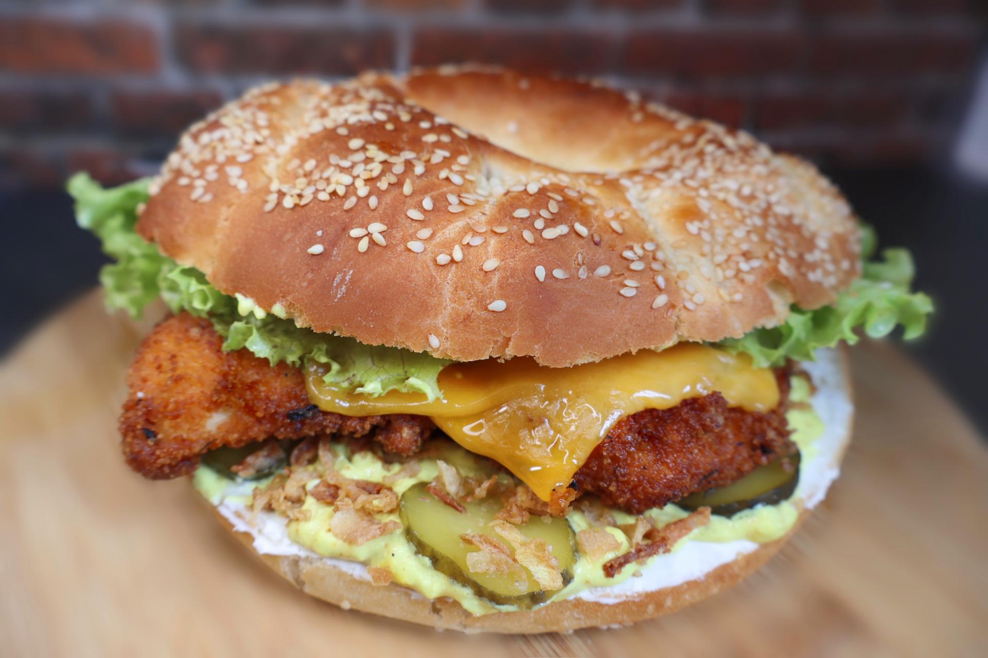 Découvre Le Surya, le bagel qui réchauffe les papilles ! Poulet pané croustillant, cream cheese fondant, cheddar, salade croquante, cornichons et oignons frits se mélangent avec une sauce curry maison. Un vrai voyage de saveurs qui met du soleil dans ton repas !